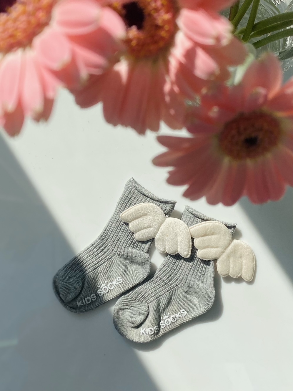 Anielskie, szare skarpetki dla Twojej małej damy w dwóch rozmiarach: S i M. Sprawdzą się idealnie do eleganckich oraz sportowych butów.