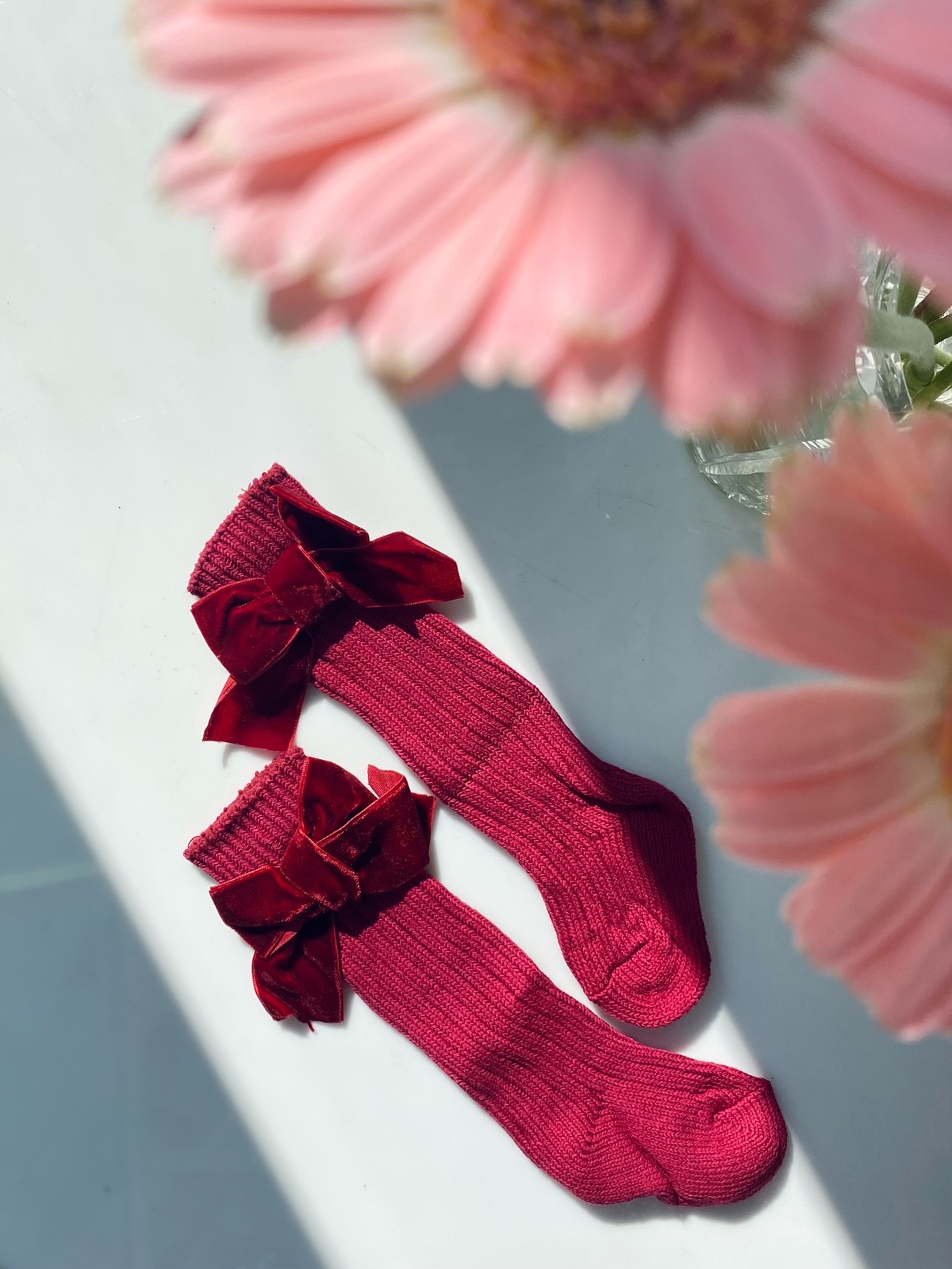 Podkolanówki z aksamitną kokardką bordo